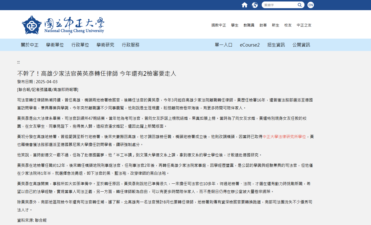 除黃英彥外,南部地區院檢今年還有司法官轉任潮,據了解,北高雄有一名法官預計8月也要轉任律師,地檢署則傳有資深檢察官要轉換跑道,南部司法圈流失不少優秀司法人才。