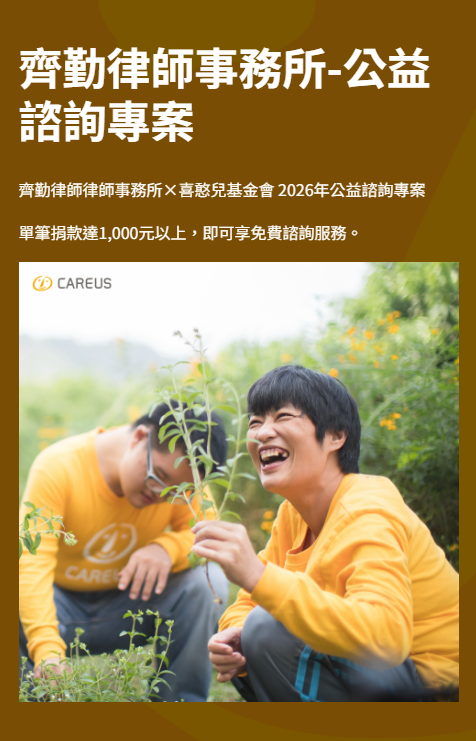 本所與喜憨兒基金會合作,邀您一起來做公益,同時還能諮詢法律問題,一舉兩得~