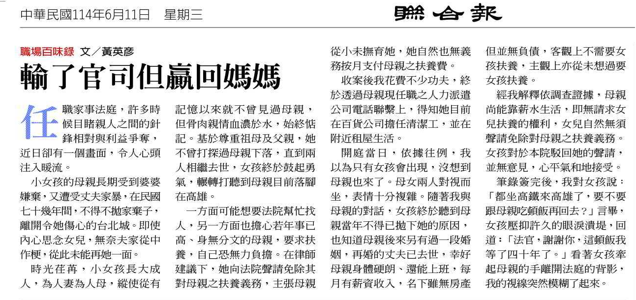 聯合報 文章分享-圓滿的家事案件(免除扶養義務)